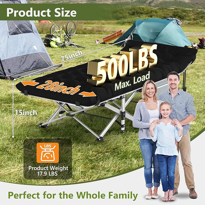 - 【Heavy-Duty】 Built with 1200D Oxford Cloth and 10 support legs, this cot can support up to 500 lbs. The square steel frame ensures stability and durability, making it suitable for both adults and kids.