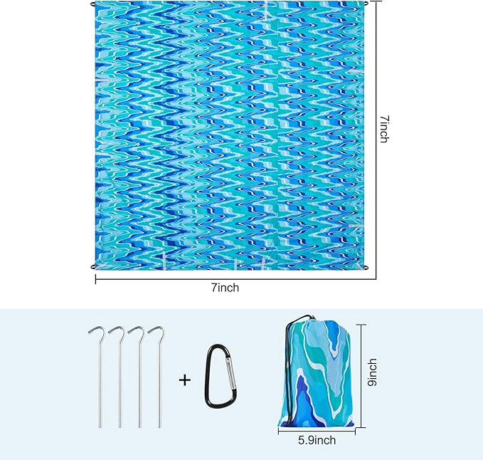 - Portable & Hassle-Free Cleanup:Folds into a compact 9"x 5.9" travel pouch for effortless packing. Shake off sand in seconds or toss it in the washing machine—no complicated maintenance required. Bonus sand-proof corners keep the mat anchored on breezy days.