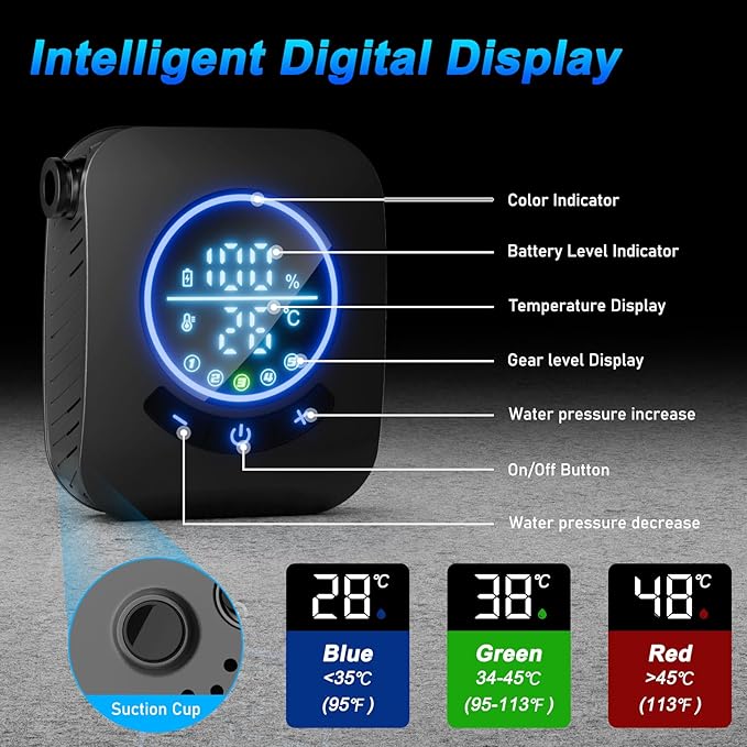 - INTELLIGENT LED DISPLAY - The LED display shows real-time battery life, water temperature (55-122°F) , and current water flow level. The display also uses color-coded temperature alerts (green/blue/red) to indicate safe or extreme water temperatures, helping you avoid discomfort or burns