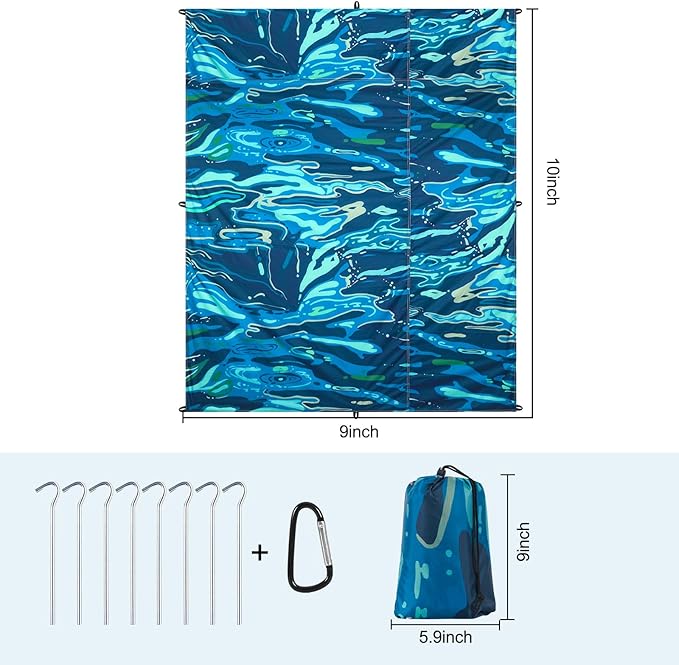 - Portable & Hassle-Free Cleanup:Folds into a compact 9"x 5.9" travel pouch for effortless packing. Shake off sand in seconds or toss it in the washing machine—no complicated maintenance required. Bonus sand-proof corners keep the mat anchored on breezy days.