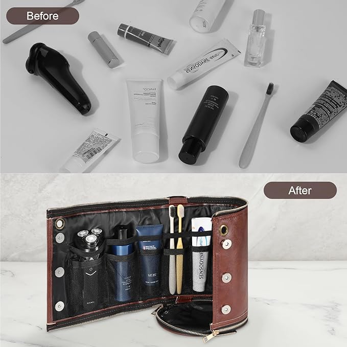 - Waterproof & Easy Maintain: Made of premium PU leather, Our mens toiletry travel bag is sturdy and wear-resistant, not easy to damage. The surface has undergone special waterproof treatment, effectively protecting your toiletries from moisture damage. And, it is easy to clean. Simply wipe it with a damp cloth, then it will look as good as new.