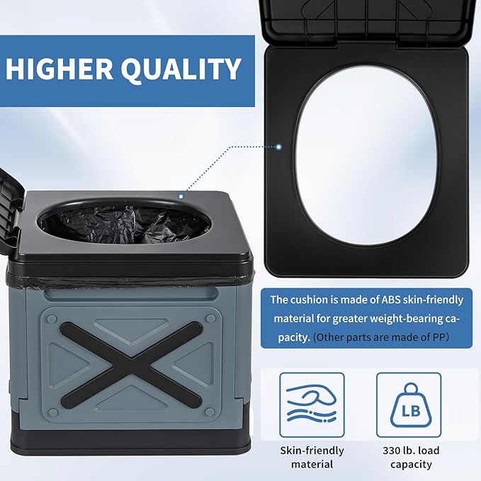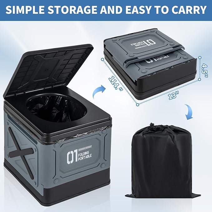 - [Folding Camping Toilet] Made of ABS plastic , supports 330 lbs (150 kg) ,Multi-Use Function,it Includes 12 liquid waste gel packs and 12 trash bags,portable and stable