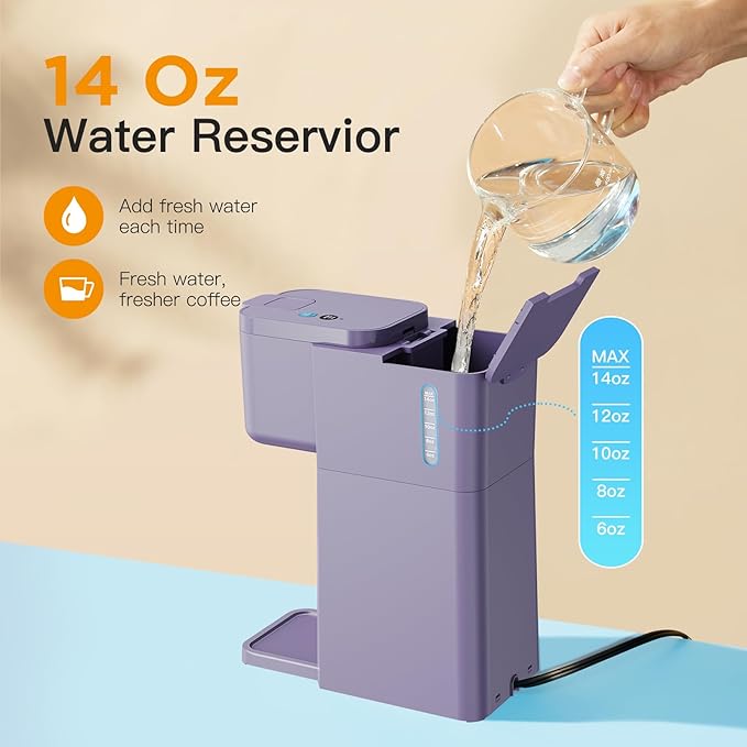 - 6~14oz Brew Size: Adjust the brew amount by filling to the appropriate ounce level. Water tank is not removable and needs to add water each time for fresher and more flavorful coffee