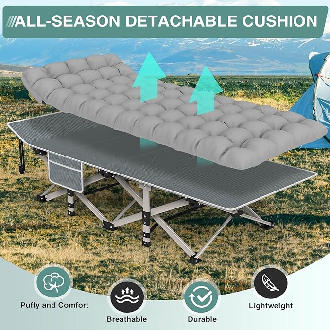 - 【Easy to Fold】Maximize your adventure time with our cot's innovative folding system. Set up and fold in just 10 seconds without any tools! This quick setup means more time to explore, relax, and enjoy nature, making it ideal for every outdoor enthusiast who values convenience and efficiency. Updated version with more easier to fold for quick setup and takedown.