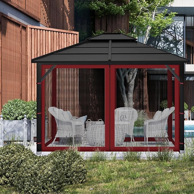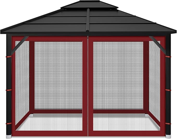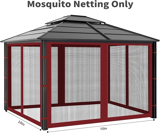 Gazebo Replacement Mosquito Netting Outdoor Universal Gazebo Canopy 4-Panels Screen Sidewalls with Zipper for Patio Garden (Red, 10x10)