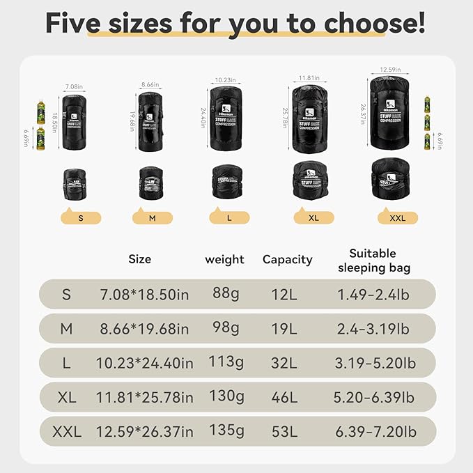 • 【SAVE 50% MORE SPACE】Our compression stuff sack is an incredibly simple and practical solution to space-saving, they will give you more space to pack what you need and give you an unprecedented portable experience