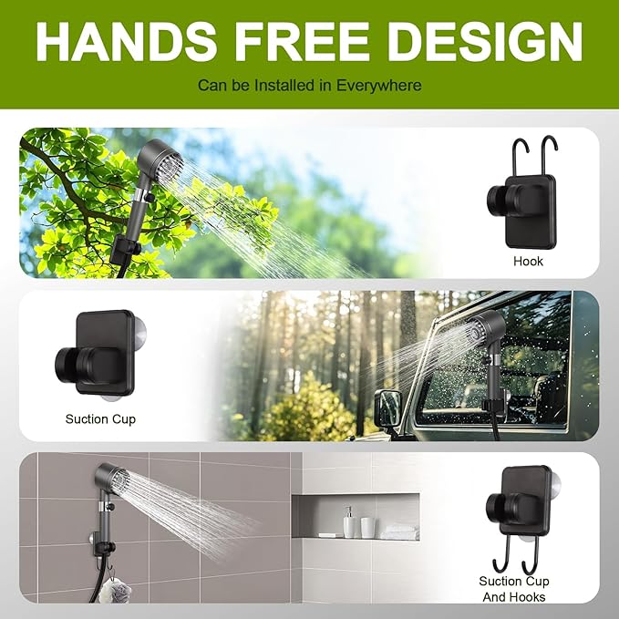 - 3+1 Switchable Shower Modes: The portable shower is equipped with a shower head and a spray head, and has three practical water discharge settings, which can be easily switched by simply rotating the handle of the shower head. Thanks to the adjustable sliding bracket, the shower head can be adjusted up and down for a wider flow range. A bonus hook allows you to hang it securely on a tree branch or tent stand. The included suction cup allows the shower head to be fixed on any smooth flat surface