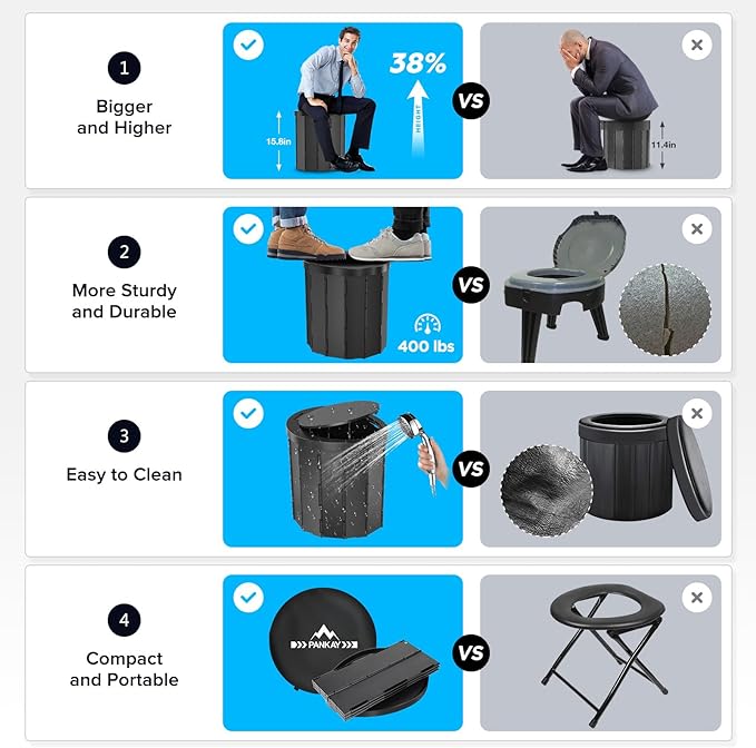 • ALL IN 1 PORTABLE TOILET KIT FOR ADULTS - The package includes 1 camping toilet, 1 privacy pop up tent, 1 potable carry bag, 1 instruction manual, 4 ropes, 4 ground stakes, and 12 waste bags. The innovative design allows for quick unfolding and setup. Our portable toilet is perfect for “Got To Go Now!” events.
